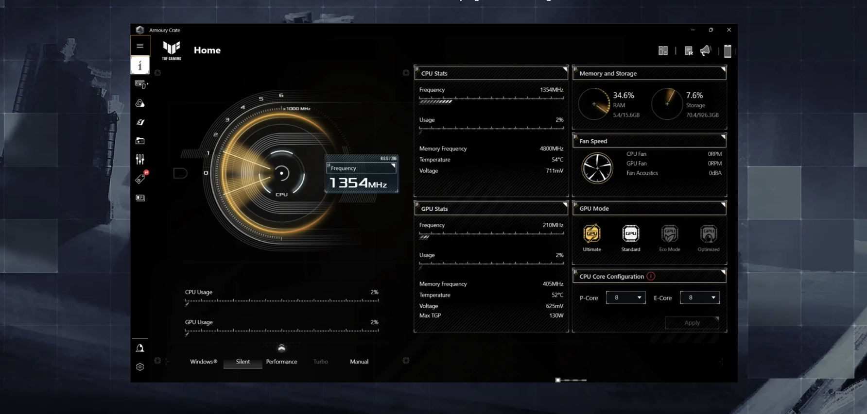 TUF Gaming F16, RGB aydınlatma ve fan kontrolü gibi özelliklerle donatılmış Armoury Crate desteği ile geliyor. Tek bir tuşla özelleştirilmiş senaryo profilleri oluşturabilir ve makine hangi programların çalıştığını algıladığında yüksek performans ile yüksek verimlilik modları arasında akıllıca geçiş yapmasını sağlayabilirsiniz.
